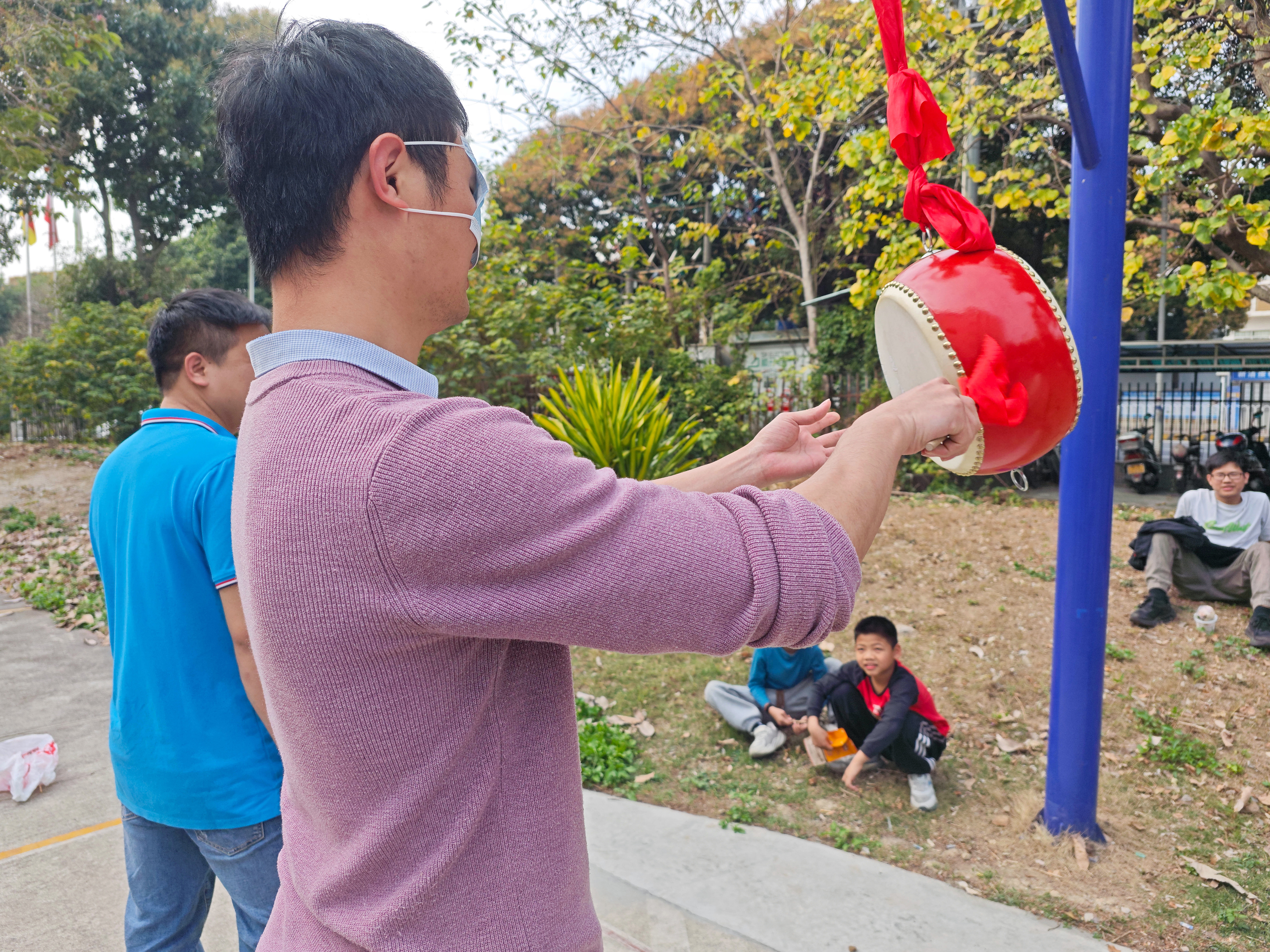 原地轉三圈后,各位同事手持鼓槌,小心翼翼地朝著前方懸掛的鼓摸索前行。